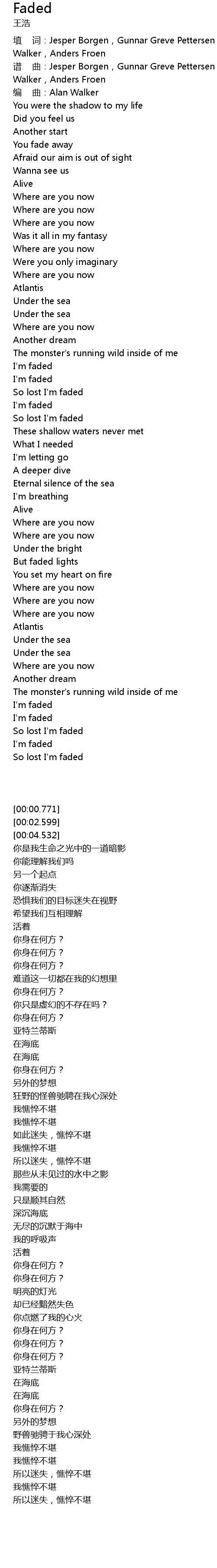 | [00:00.771] | tián cí: Jesper Borgen, Gunnar Greve Pettersen, Alan Walker, Anders Froen |