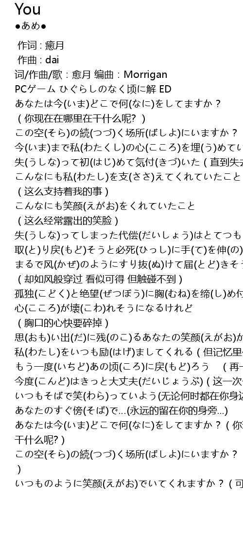 | [02:51.662] | いつものように笑颜(えがお)でいてくれますか?(可以像平时那样保持着笑脸吗?) |