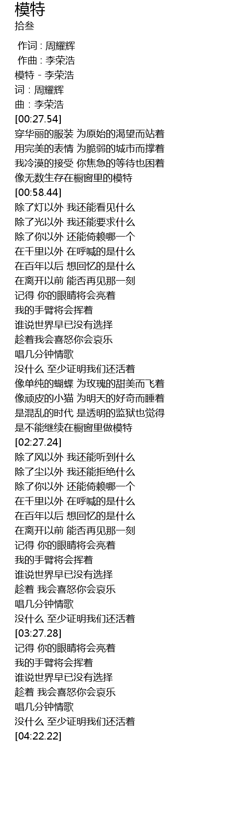 | [00:02.51] | 模特 - 李荣浩 |