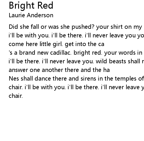 's a brand new cadillac. bright red. your words in my ears. i'll be with you. i'll be there. i'll never leave you. wild beasts shall rest there and owls shall answer one another there and the ha |