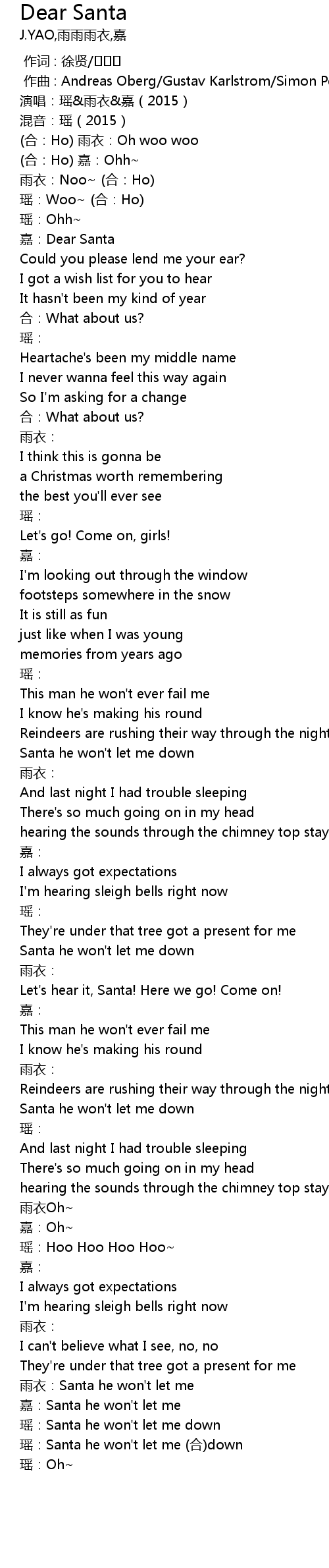 | [03:37.340] | 瑶:Santa he won't let me (合)down |