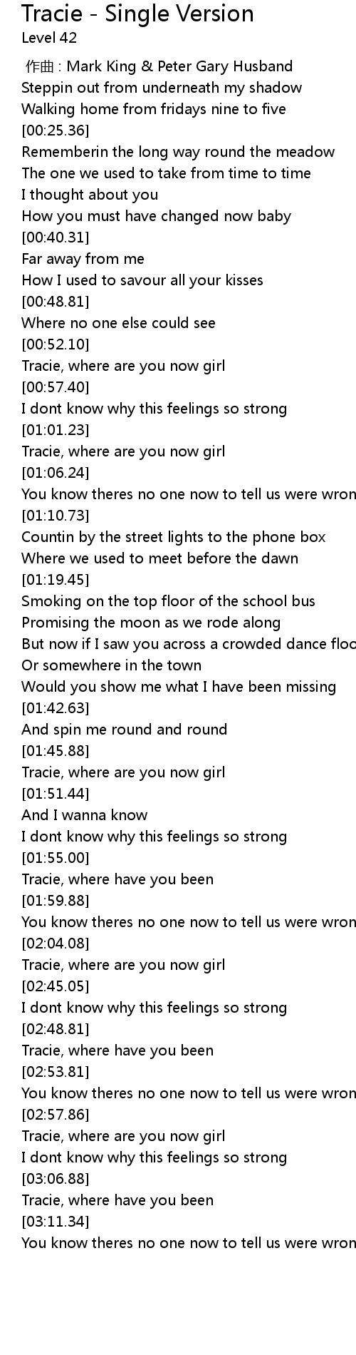 | [00:54.78] | Tracie, where are you now girl |