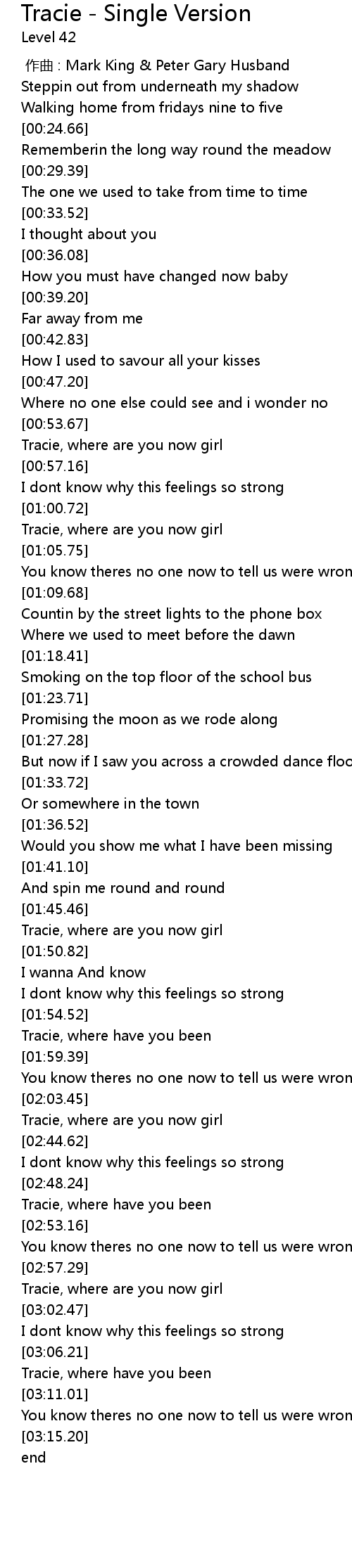 | [02:41.94] | Tracie, where are you now girl |