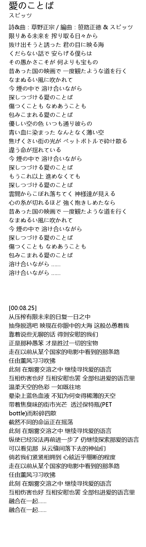| [00:08.25] | 詩&曲:草野正宗/編曲:笹路正徳 & スピッツ |