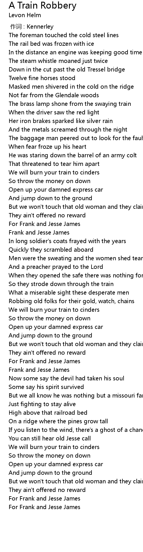 | [02:11.29] | For Frank and Jesse James |
