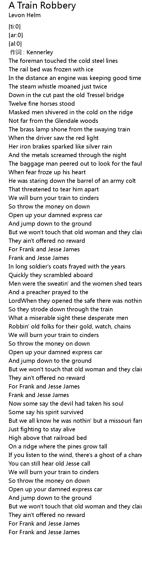 | [05:00.200] | For Frank and Jesse James |