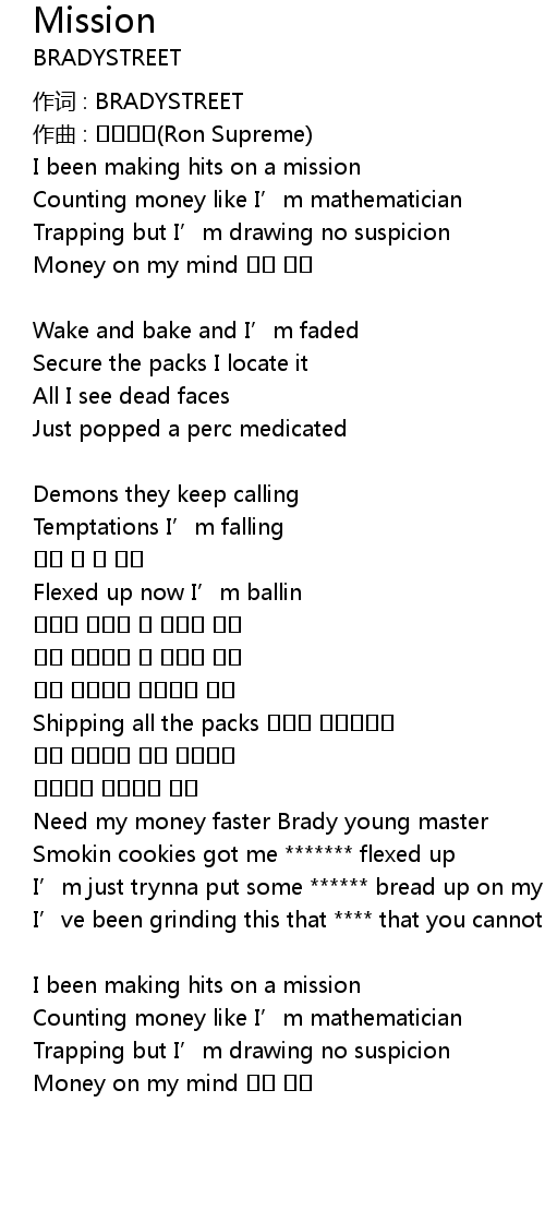 | I been making hits on a mission | |