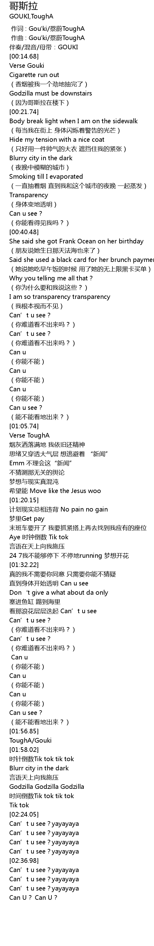 | [00:00.000] | 作词 : Gou'ki/蔡蔚ToughA |