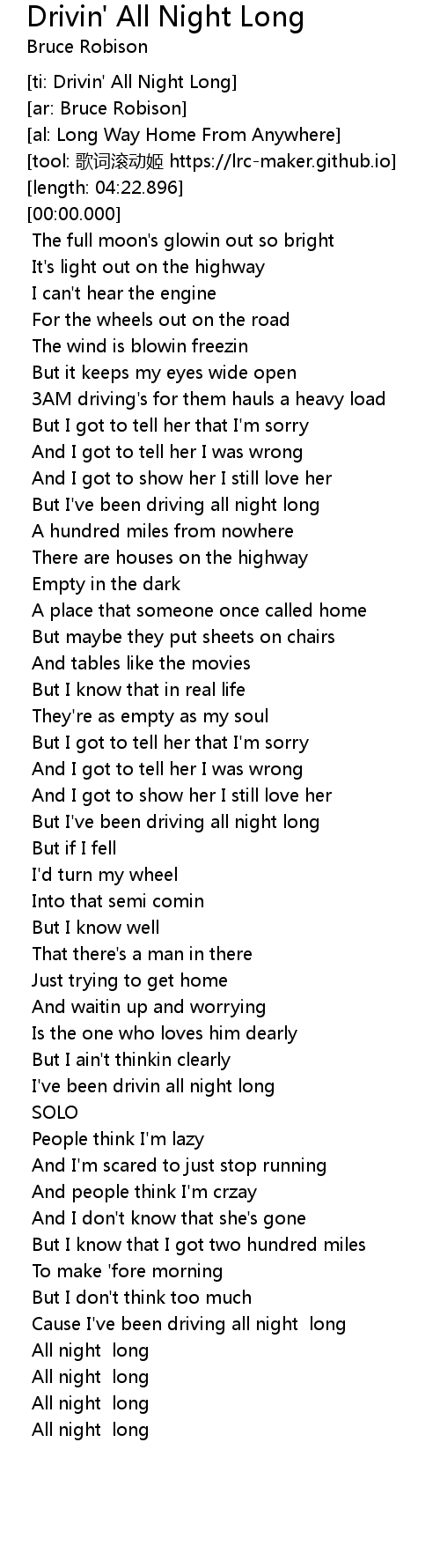 | [00:49.470] | But I've been driving all night long |