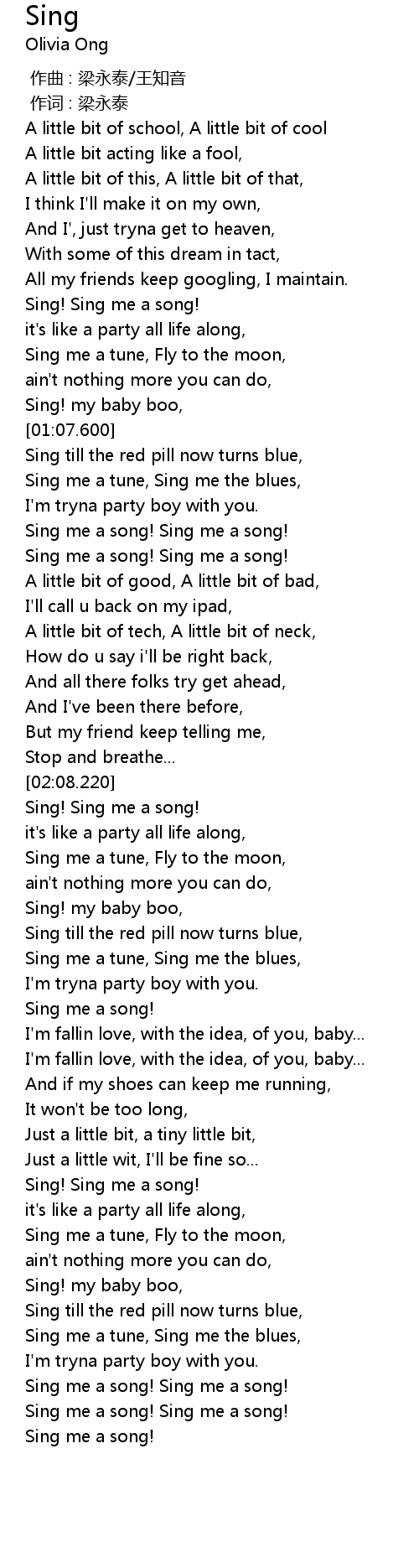 | [02:32.950] | Sing me a tune, Sing me the blues, |