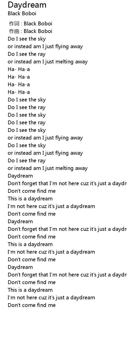 | [02:39.43] | Don' t forget that I' m not here cuz it' s just a daydream |