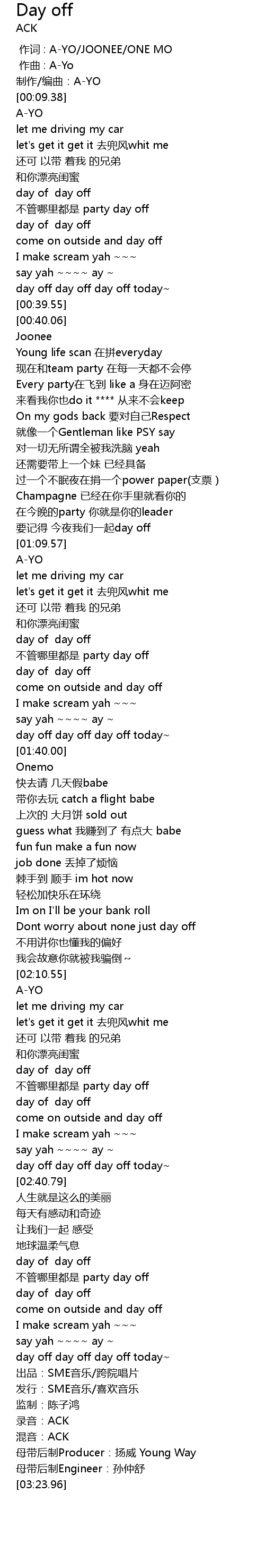 | [03:03.93] | bù guǎn nǎ lǐ dōu shì party day off |