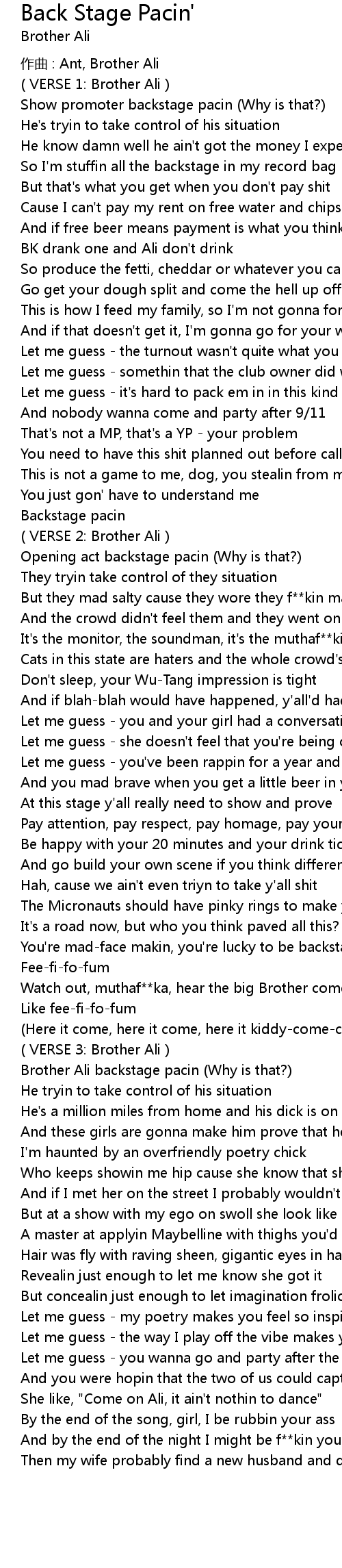 | You' re madface makin, you' re lucky to be backstage pacin | |