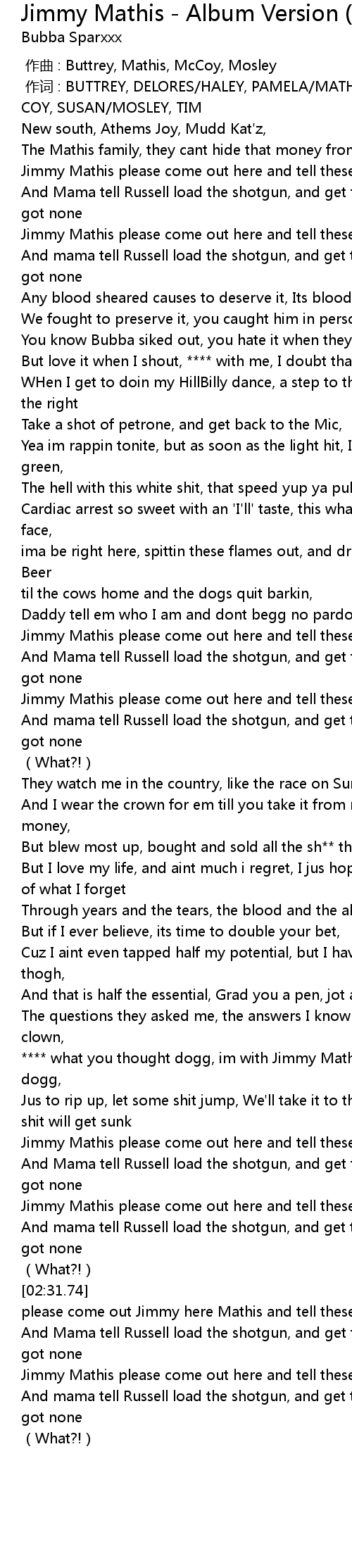 | [02:04.06] | **** what you thought dogg, im with Jimmy Mathis ol truck with a saw dogg, |