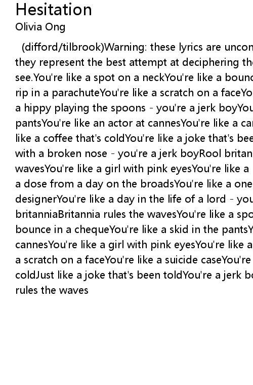 (difford/tilbrook)Warning: these lyrics are unconfirmed and may be inaccurate. they represent the best attempt at deciphering the song we have yet to see.You're like a spot on a neckYou're like a bounce in a chequeYou're like a rip in a parachuteYou're like a scratch on a faceYou're like a suicide caseLike a hippy playing the spoons - you're a jerk boyYou're like a skid in the pantsYou're like an actor at cannesYou're like a car with a broken hoseYou're like a coffee that's coldYou're like a joke that's been toldYou're like a model with a broken nose - you're a jerk boyRool britanniaBritannia rules the wavesYou're like a girl with pink eyesYou're like a loser that triesYou're like a dose from a day on the broadsYou're like a one armed minerYou're like a mirror designerYou're like a day in the life of a lord - you're a jerk boyRool britanniaBritannia rules the wavesYou're like a spot on a neckYou're like a bounce in a chequeYou're like a skid in the pantsYou're like an actor at cannesYou're like a girl with pink eyesYou're like a loser that triesYou're like a scratch on a faceYou're like a suicide caseYou're like a coffee that's coldJust like a joke that's been toldYou're a jerk boyRool britanniaBritannia rules the waves |