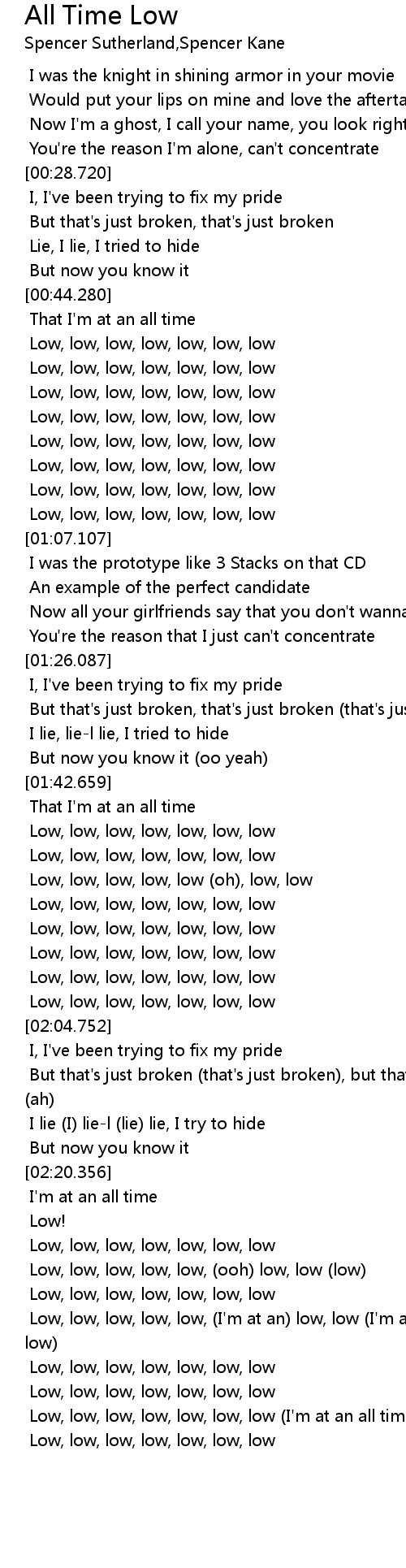 Low, low, low, low, low, (I'm at an) low, low (I'm at an all time low) |