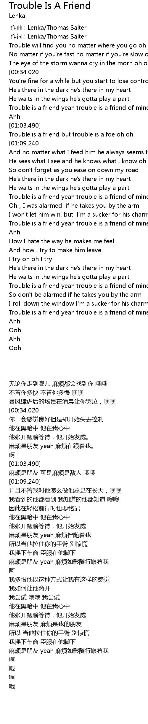 | [01:04.790] | Trouble is a friend but trouble is a foe oh oh |