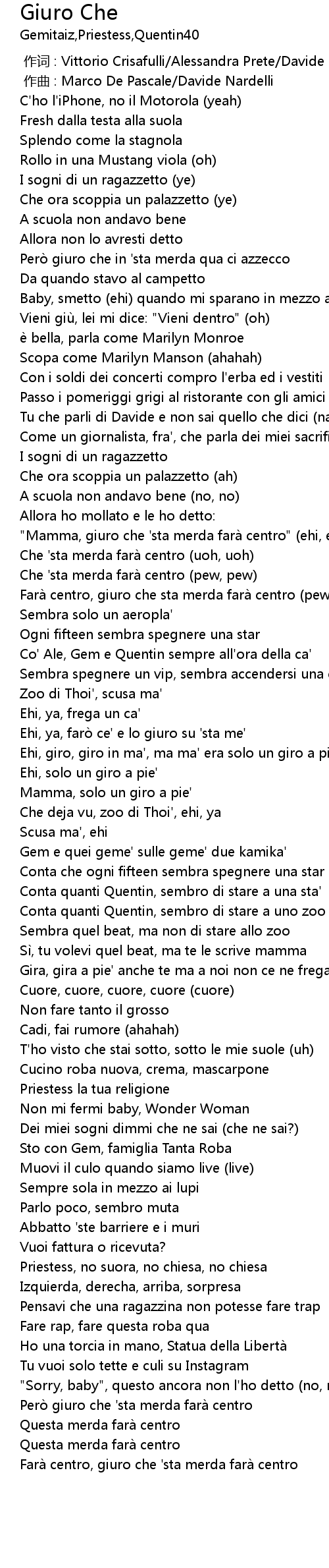 | [00:25.57] | Però giuro che in ' sta merda qua ci azzecco |