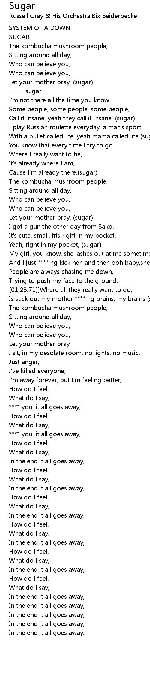 [01:24.33] Is suck out my mother ****ing brains, my brains (sugar).