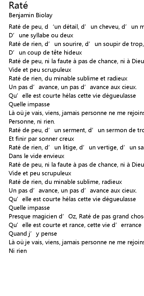 | Raté de rien, d' un sourire, d' un soupir de trop, | |
