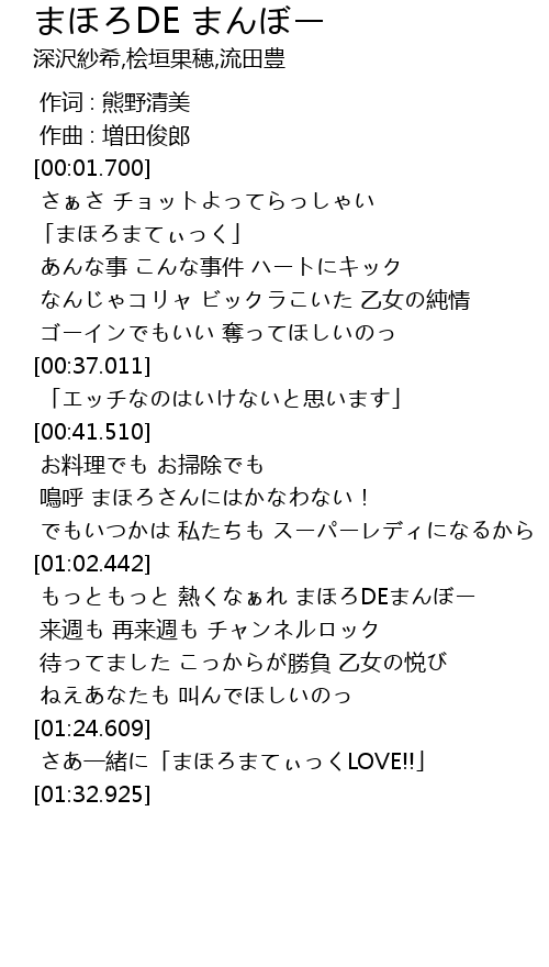 | [01:06.942] | もっともっと 熱くなぁれ まほろDEまんぼー |