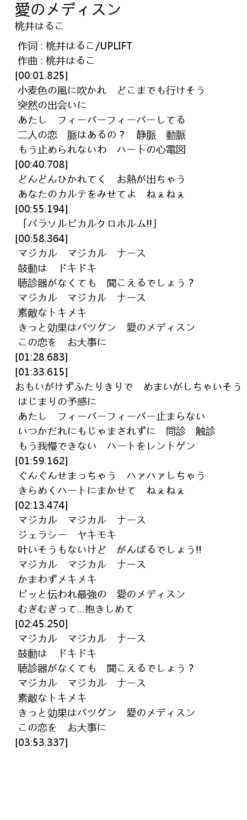 | [02:34.362] | ピッと伝われ最強の 愛のメディスン |