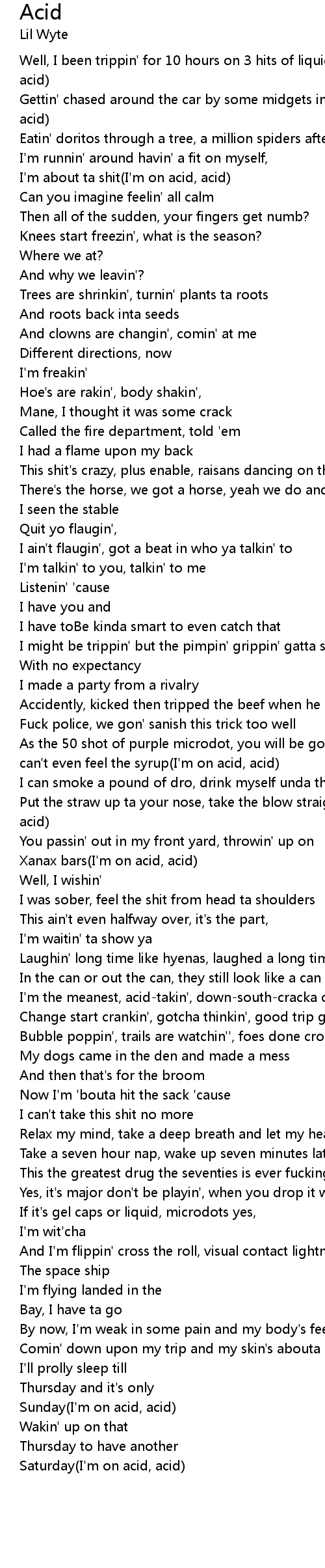 Well, I been trippin' for 10 hours on 3 hits of liquid microdot(I'm on acid, acid) |