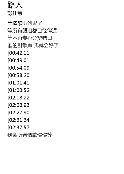 | [02:55.45][02:18.22][01:09.03] | 又何必去恨 擦肩的路人 |