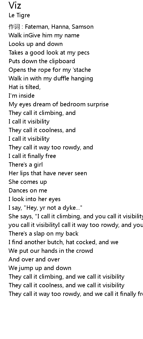 | She says, "I call it climbing, and you call it visibilityI call it coolness, and you call it visibilityI call it way too rowdy, and you call it finally free" | |