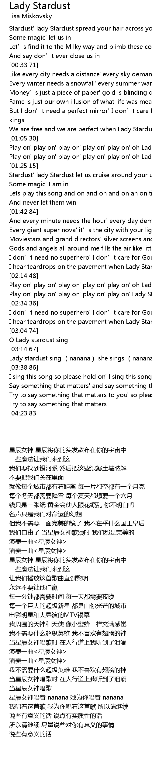 | [00:15.90] | Stardust' lady Stardust spread your hair across your universe |