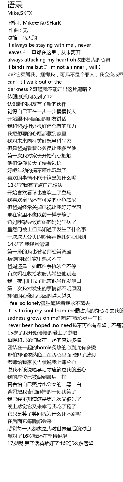 | [02:09.661] | 15岁了我开始慢慢的爱上了说唱 |