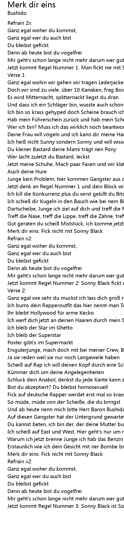 | Scheiß auf Rap ich will deinen Kopf durch eine Scheibe schlagen | |