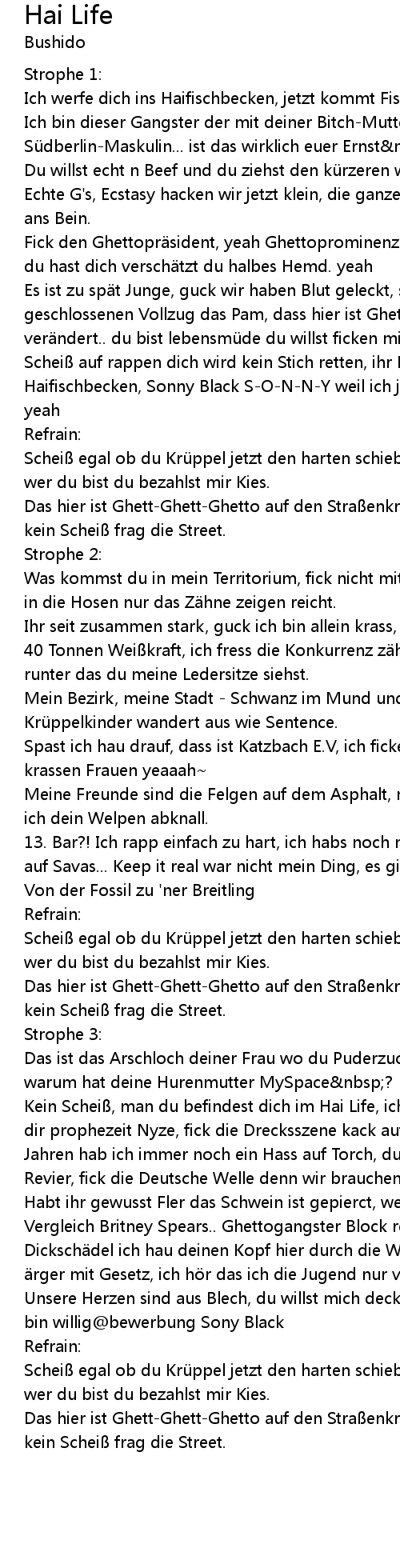 | Das hier ist GhettGhettGhetto auf den Stra enkrieg, das hier ist Hai Life kein Schei frag die Street. | |