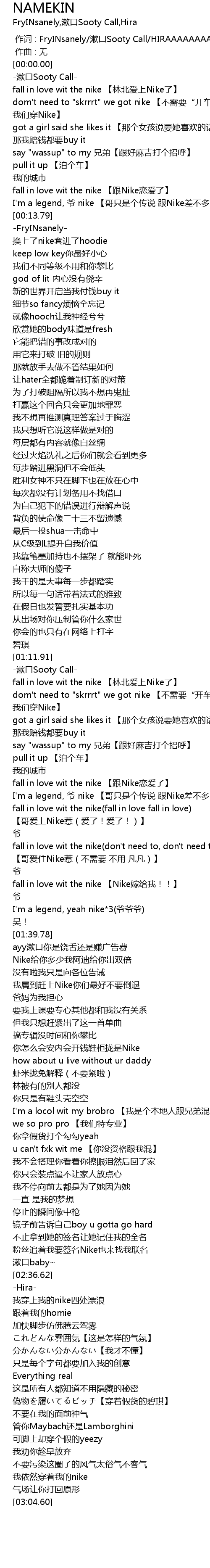 | [01:25.35] | fall in love wit the nike fall in love fall in love gē ài shàng Nike rě ài le! ài le! |