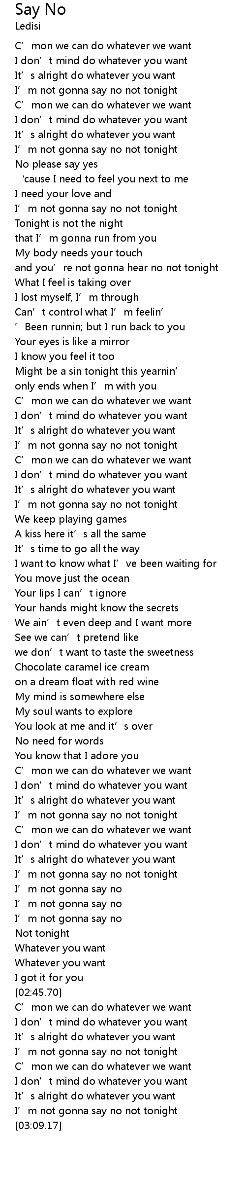 | [02:54.95] | I' m not gonna say no not tonight |