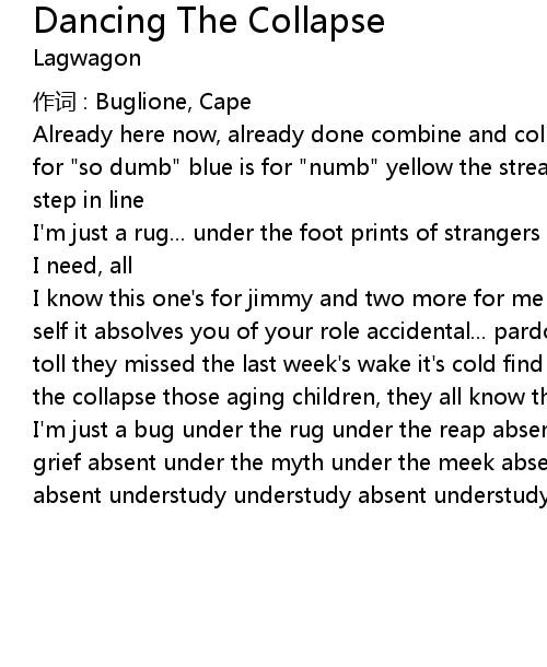 | I know this one' s for jimmy and two more for me it' s something you sell to your self it absolves you of your role accidental... pardoned the repeat offenders toll they missed the last week' s wake it' s cold find yourself here now. dance the collapse those aging children, they all know the steps | |