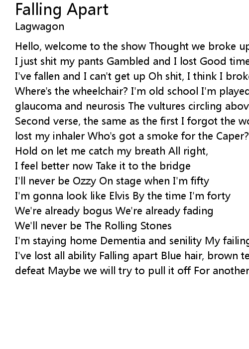 | I've lost all ability Falling apart Blue hair, brown teeth Failing livers, | |