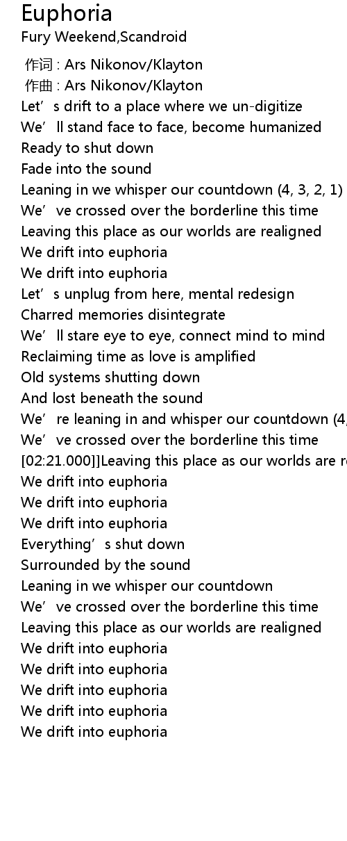 | [02:06.000] | We' re leaning in and whisper our countdown 4, 3, 2, 1 |