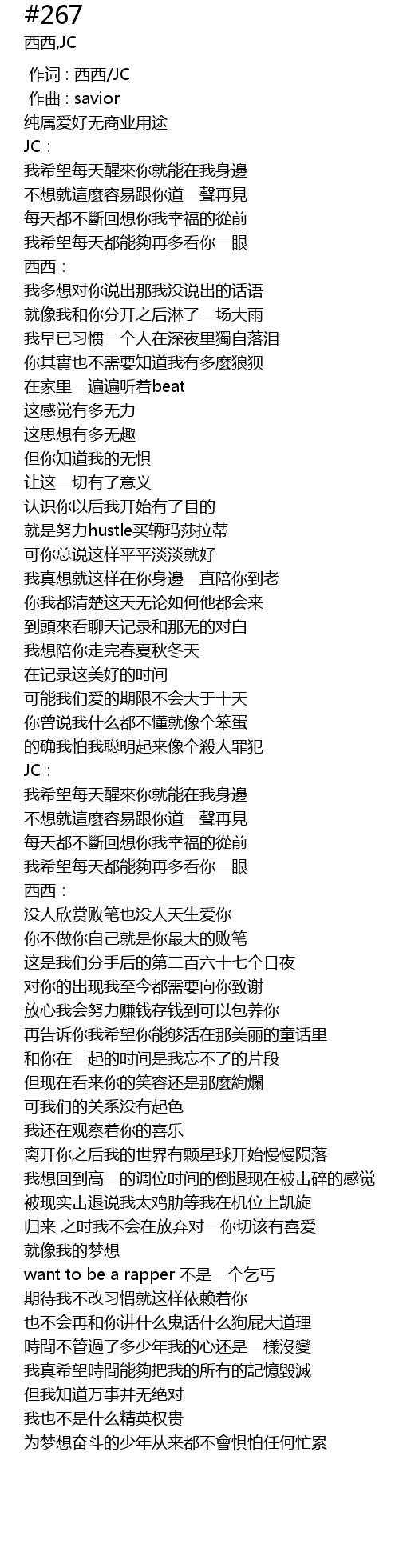 | [01:42.394] | 这是我们分手后的第二百六十七个日夜 |