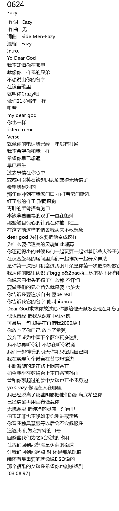 | [01:25.21] | dear god 为什么要把他变成这样 为什么要把透亮的灵魂如此埋葬 |
