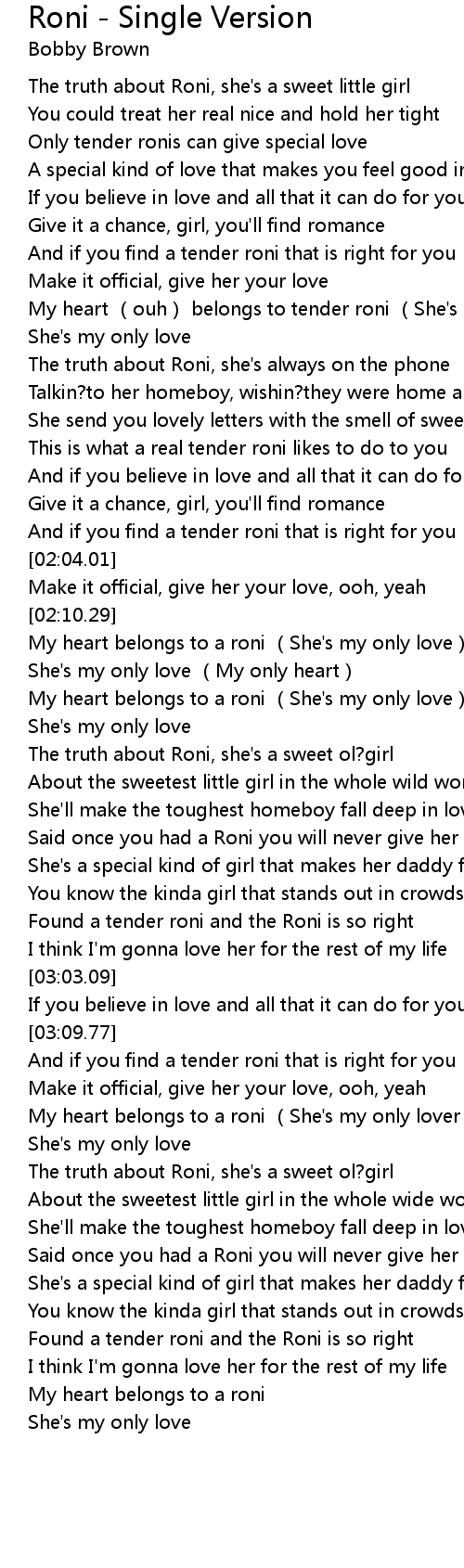 | [00:15.01] | The truth about Roni, she's a sweet little girl |