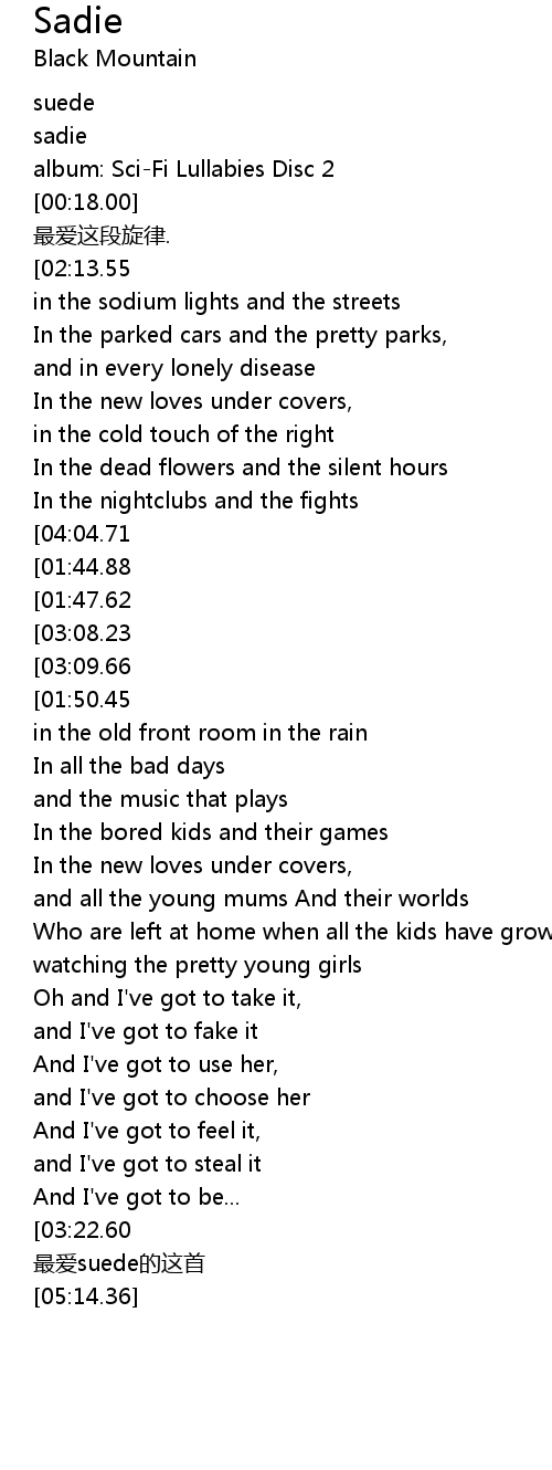 | [05:09.85][01:50.45][03:19.26][04:47.25] | Sadie....... |
