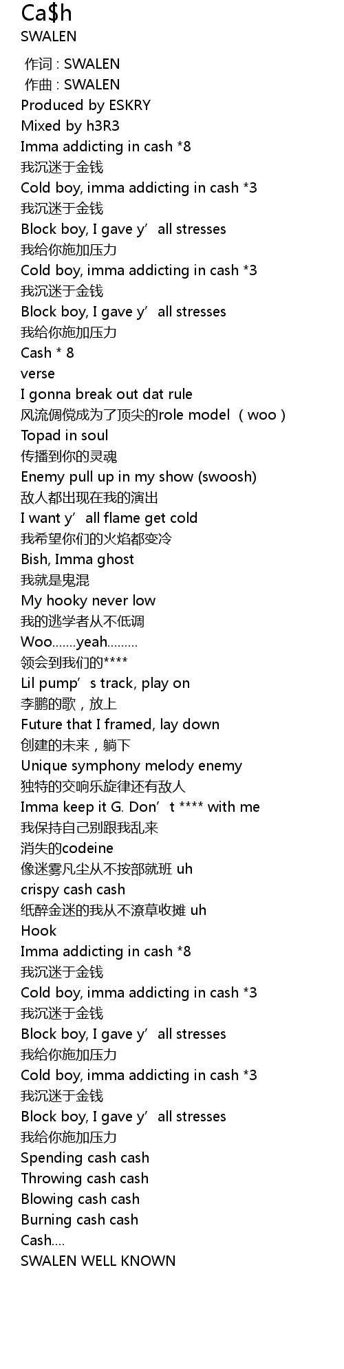 | [01:43.204] | Cold boy, imma addicting in cash *3 |
