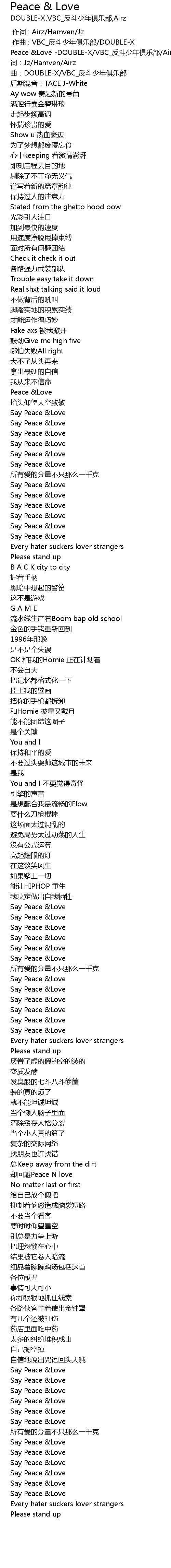 | [00:00.00] | Peace &Love -DOUBLE-X/VBC_反斗少年俱乐部/Airz |