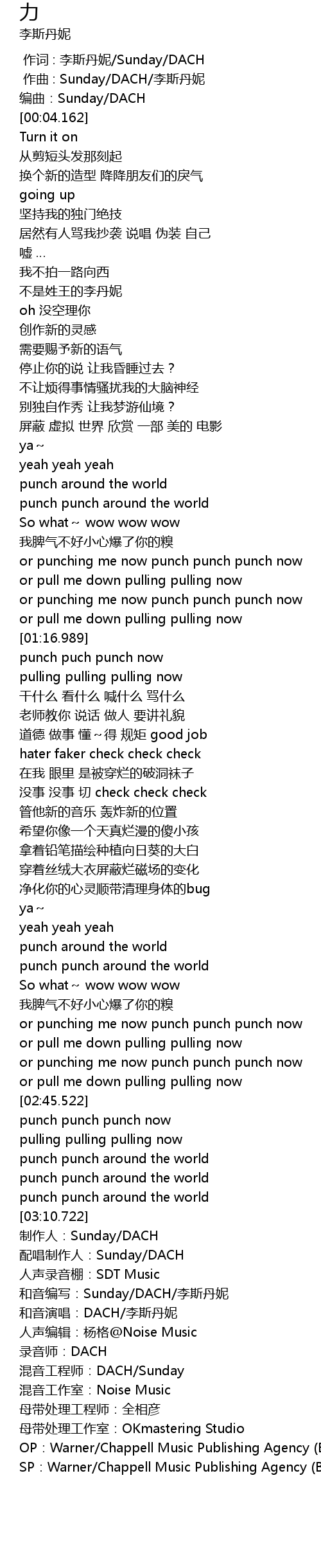 | [03:14.321] | 配唱制作人:Sunday/DACH |