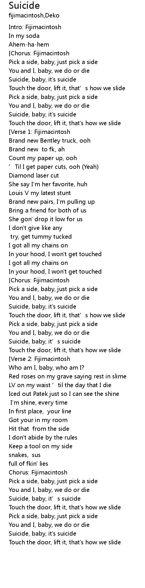 | [00:34.27] | Suicide, baby, it' s suicide |