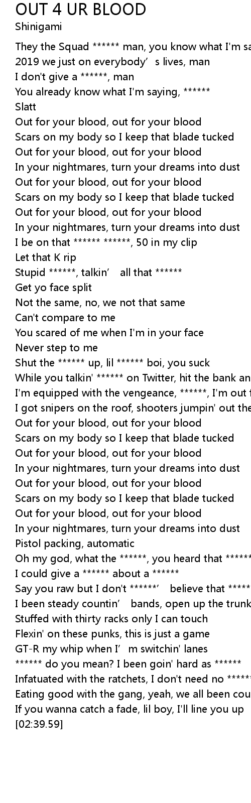 | [01:13.52] | I'm equipped with the vengeance, ******, I'm out for your blood |