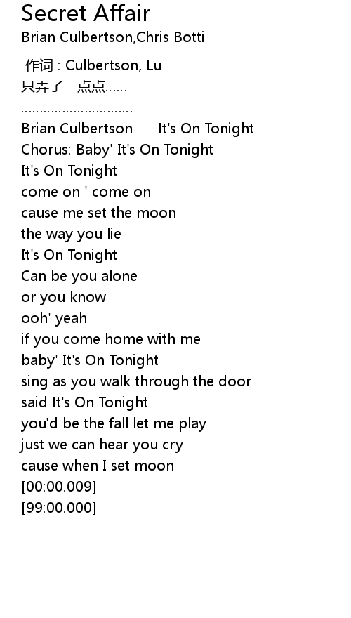 | [00:01.99] | Brian CulbertsonIt' s On Tonight |