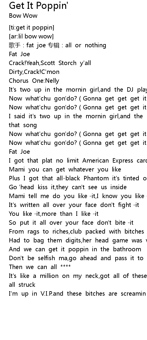 | [00:33.238] | Now what' chu gon' do? Gonna get get get it poppin |