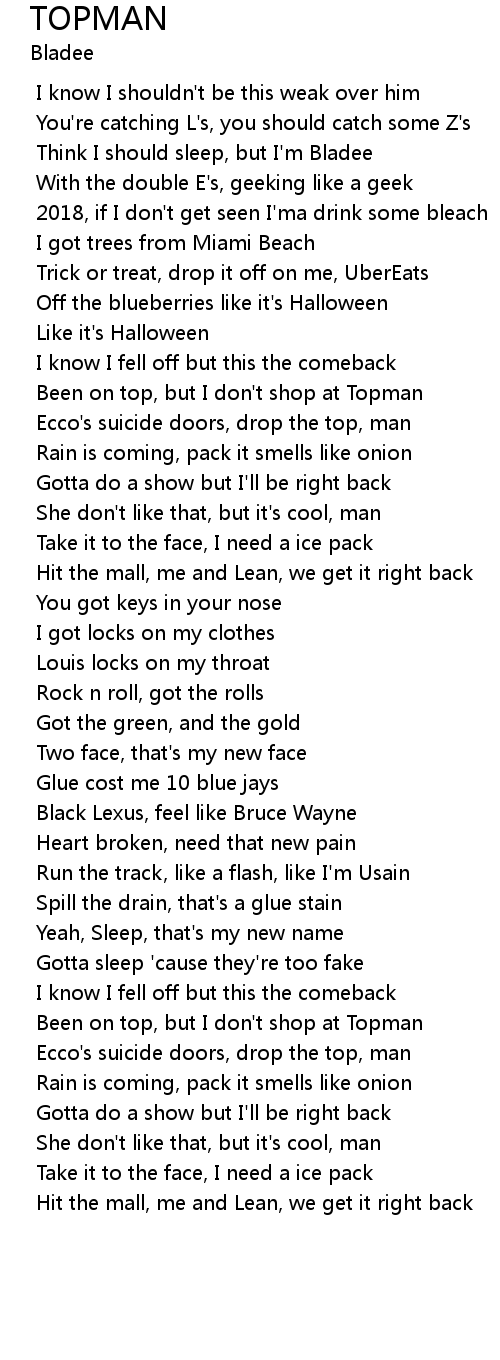 | [00:58.30] | Been on top, but I don't shop at Topman |
